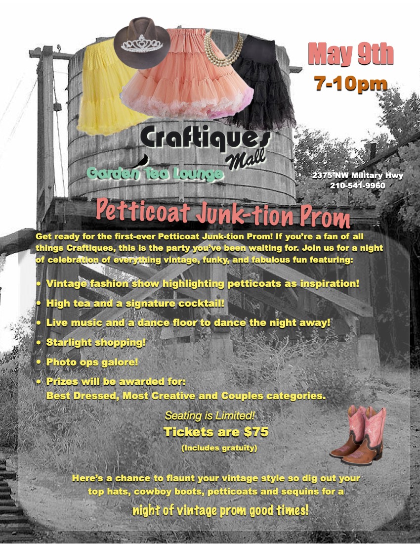 Get ready for the first-ever Petticoat Junk-tion Prom! If you’re a fan of all things Craftiques, this is the party you’ve been waiting for. Join us for a night of celebration of everything vintage, funky, and fabulous fun featuring:
